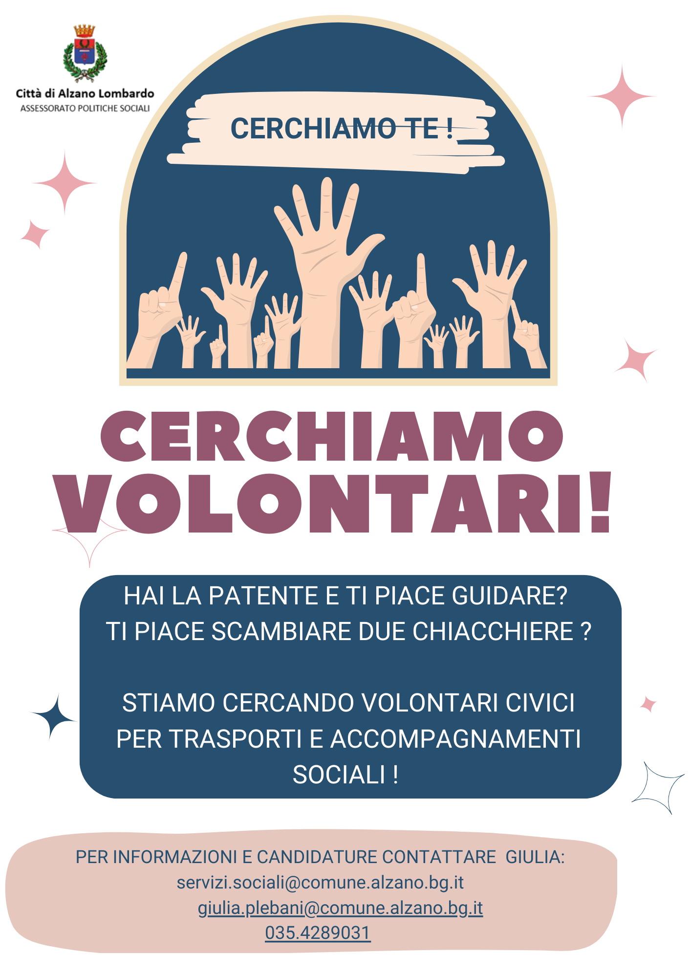 Per informazioni e candidature contattare l'Ufficio Servizi Sociali al seguente recapito 035/4289031 oppure scrivendo a servizi.sociali@comune.alzano.bg.it