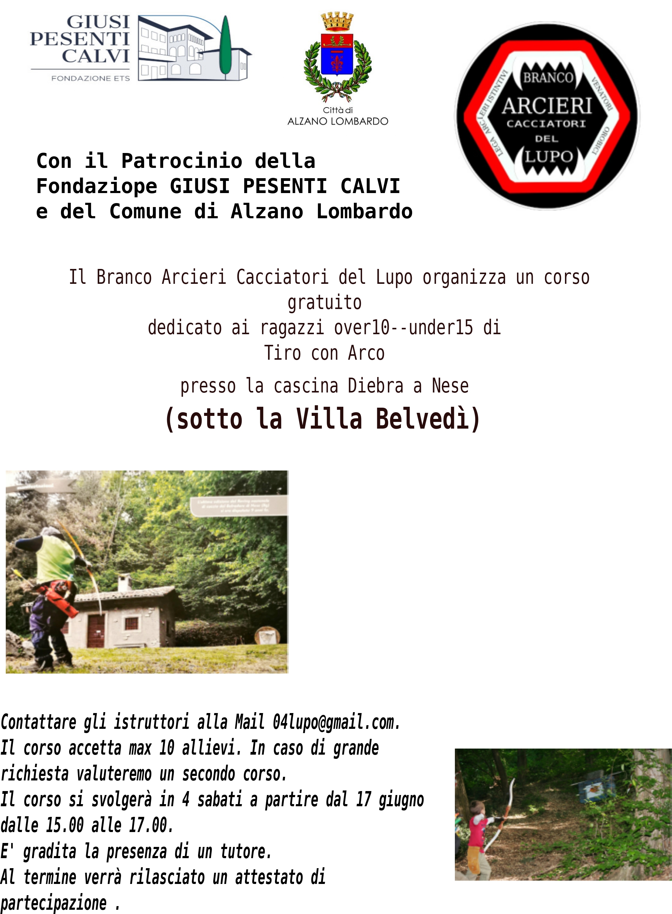 Il Branco Arcieri Cacciatori del Lupo organizza un corso gratuito di tiro con l'arco presso la cascina Diebra di Nese (sotto la Villa Belvedì) dalle 15:00 alle 17:00.